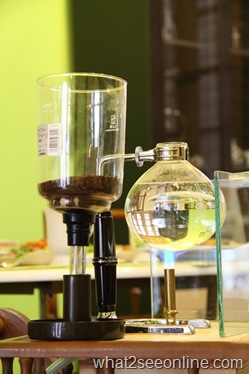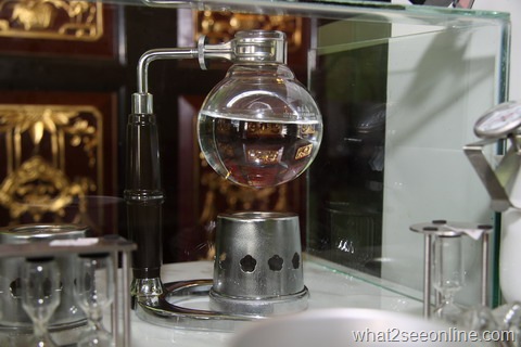 This is my first time witnessing a barista demonstrating his brewing skill using the syphon brewing method The apparatus used is something that you would have seen and used in your high school science laboratory…bunsen burner and glass flasks!