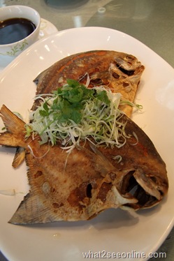 Pan Fried Pomfret Fish With Soya Sauce – The double serving of Pomfret was fried and served separately with the soya sauce and garnished with cilantro and scallion.