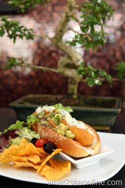 The sunshine sizzle features toppings of pickled cocktail onions, dill cucumber salsa, and sauce made with mayonnaise and cream cheese. The sauce added richness to each bite, but is much better with less of it.