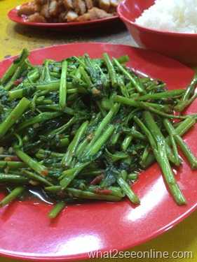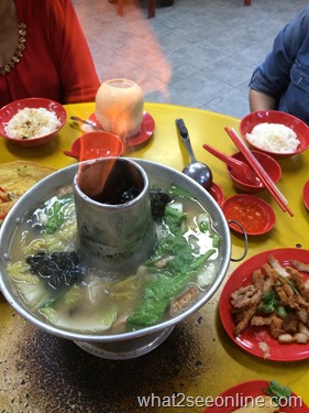 Run by the third generation, the steamboat is still served in a brazier heated by charcoal. We also had kangkung stir-fried with chili, deep-fried pork and bean curd along with the egg omelette.