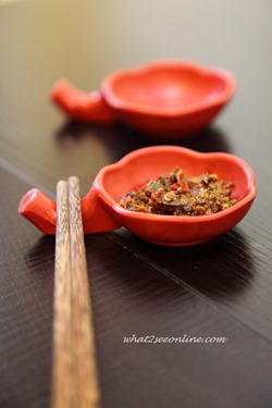 Cold appetizers are great accompaniments to the meal. There is the sour and spicy pickled Chinese cabbage with cut red chillies.