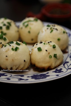 The second dish is pan-fried dumplings (shengjianbao 生煎包) with crunchy crisp-fried bottom and soft steamed top sprinkled with chopped scallions and sesame seeds. Prepared with a flavor meaty packed filling, the dumplings are firstly pan fried in oil on the underside and then cooked covered (with some water), resulting with the crisp browned bottom and a great flavor.