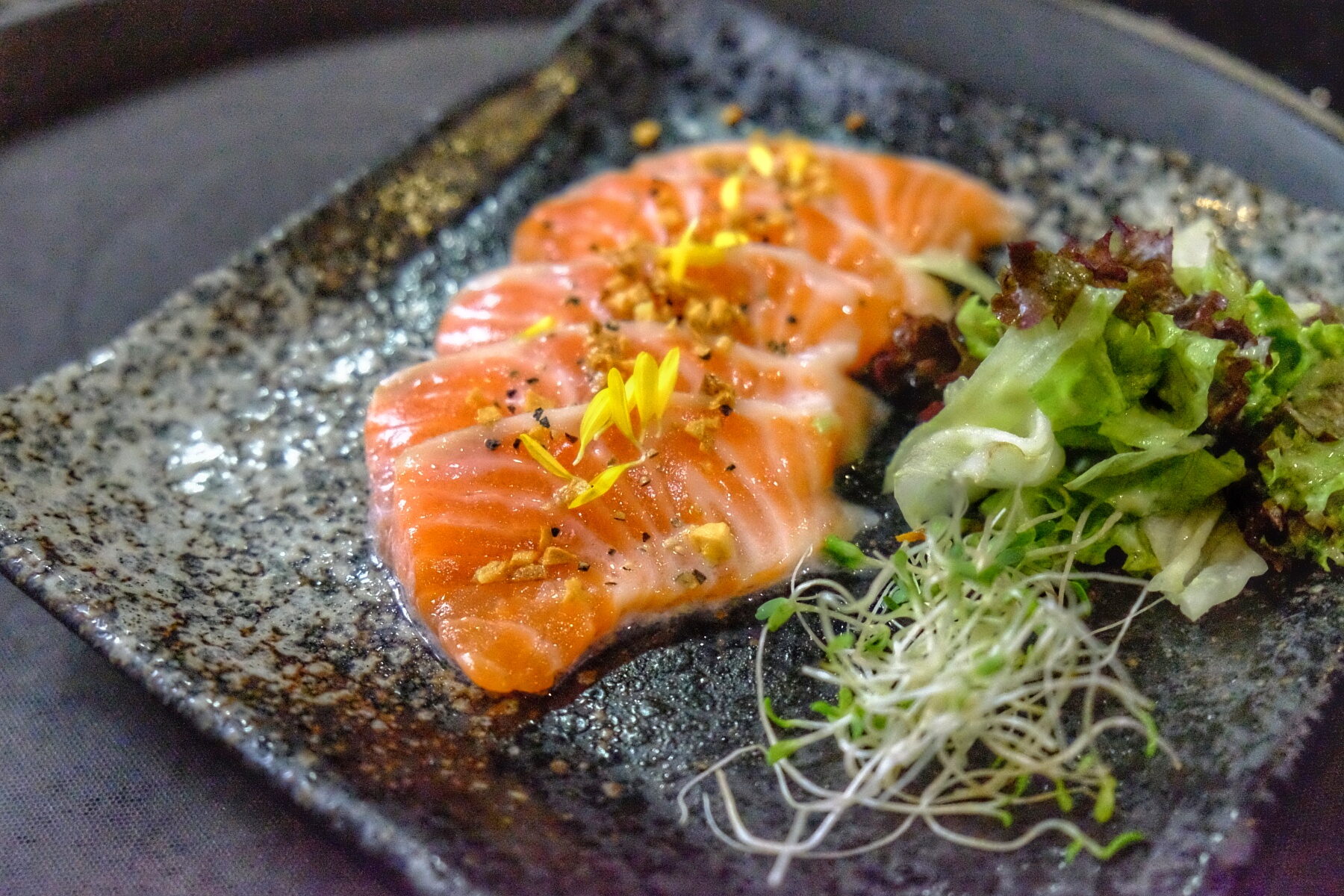 With 50% RPR, SMV:+5 and acidity 1.2, the dry sake laced with aromas of citrus, orange and yoghurt created a nice pairing for the freshness and light flavors of the salmon carpaccio.