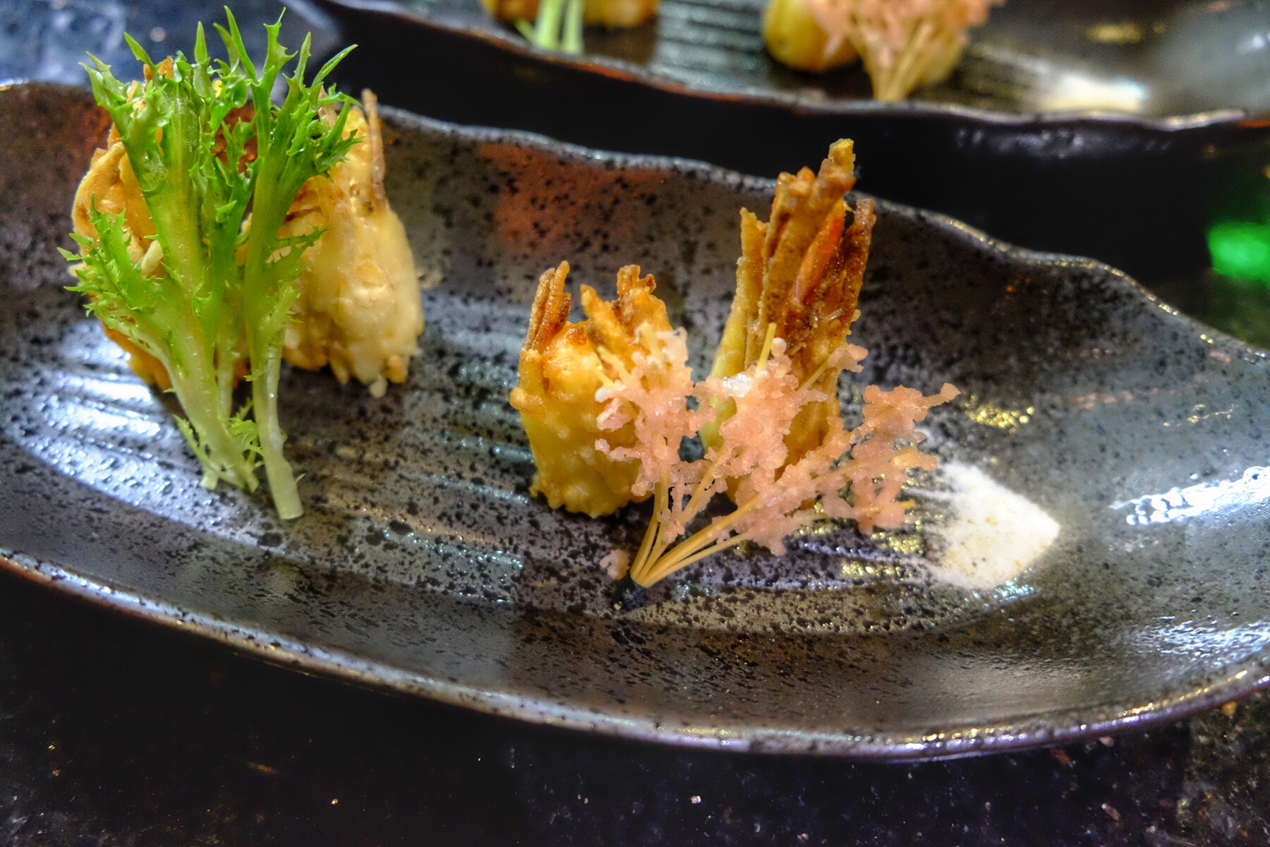 The Tengumai Junmai Umajun was paired with the appetizer dish – a trio of oyster olive tsuke, pork shishamo cheeses and salmon hotate shuto. With a slightly higher SMV value of 60%, this sake made from the Gohyakumangoku rice variety has fruity and nutty aroma.