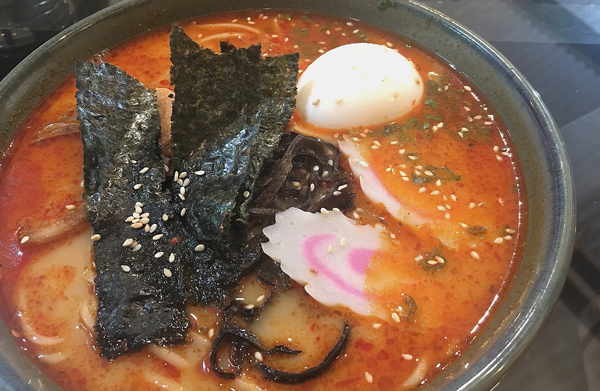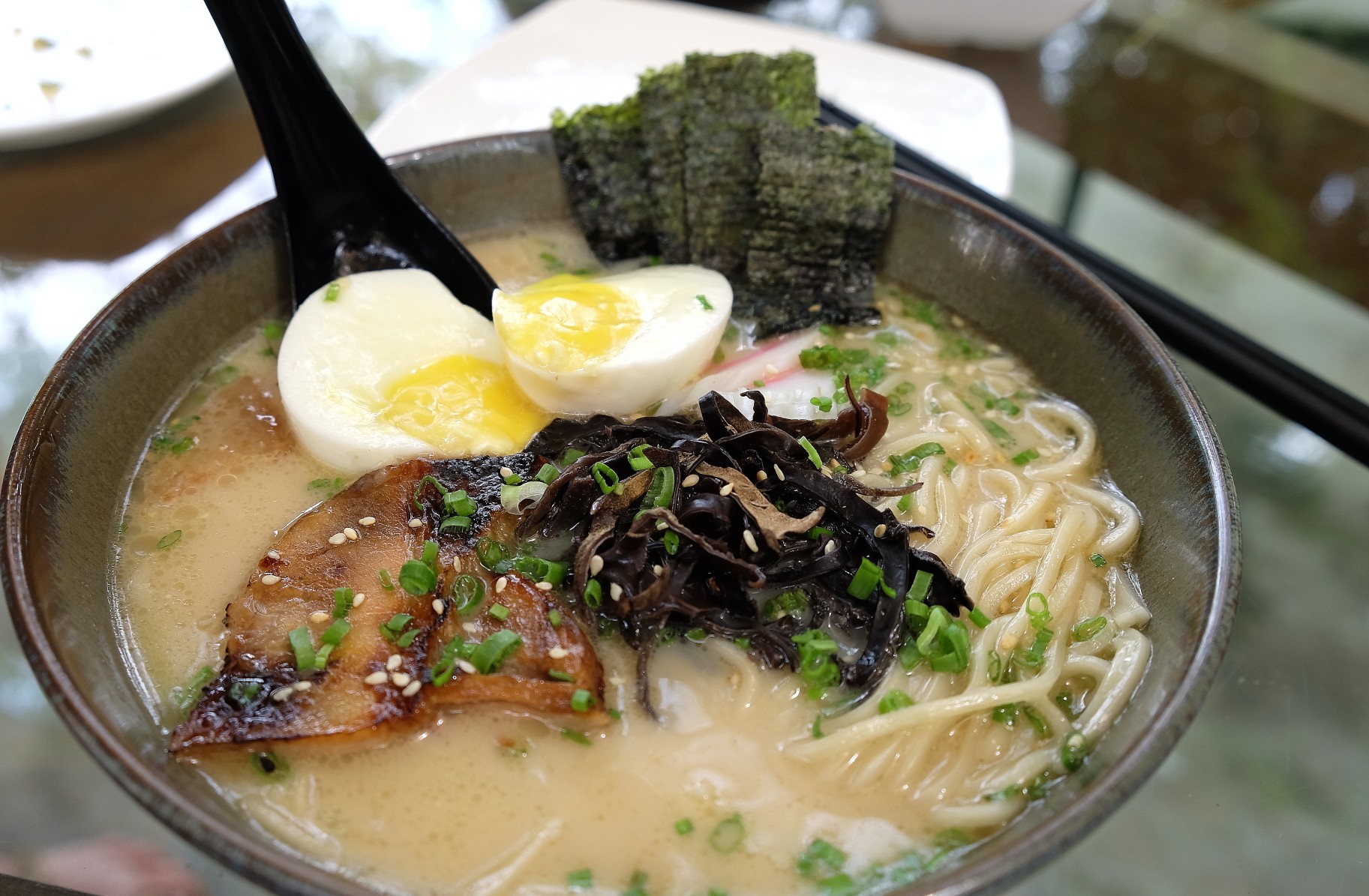 Kyushu Ramen is served in a milky white pork flavor broth topped with slices of cha shu, seaweed, bamboo shoots, black fungus, komi tamago and a sprinkling of sesame seeds.